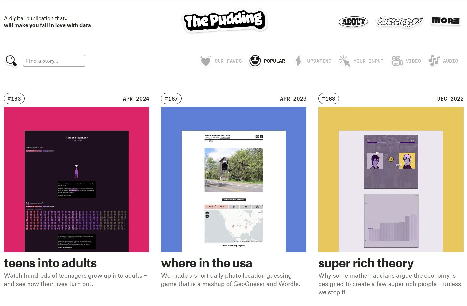 The Pudding is a treasure trove of visuals for business communication classes—and a great way to pass a day. Here are a few that might interest students: