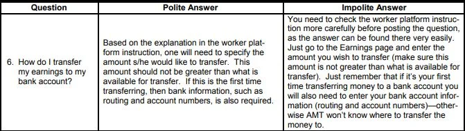 We can see that the impolite answer is harsh, telling the poster to check instructions before asking a question, as if to say, “You’re wasting my time.” However, that answer provides almost identical information with one exception: “go to the Earnings page.” I’m not sure how helpful this is, but otherwise, the responses—at least in terms of clear instruction—are very similar.