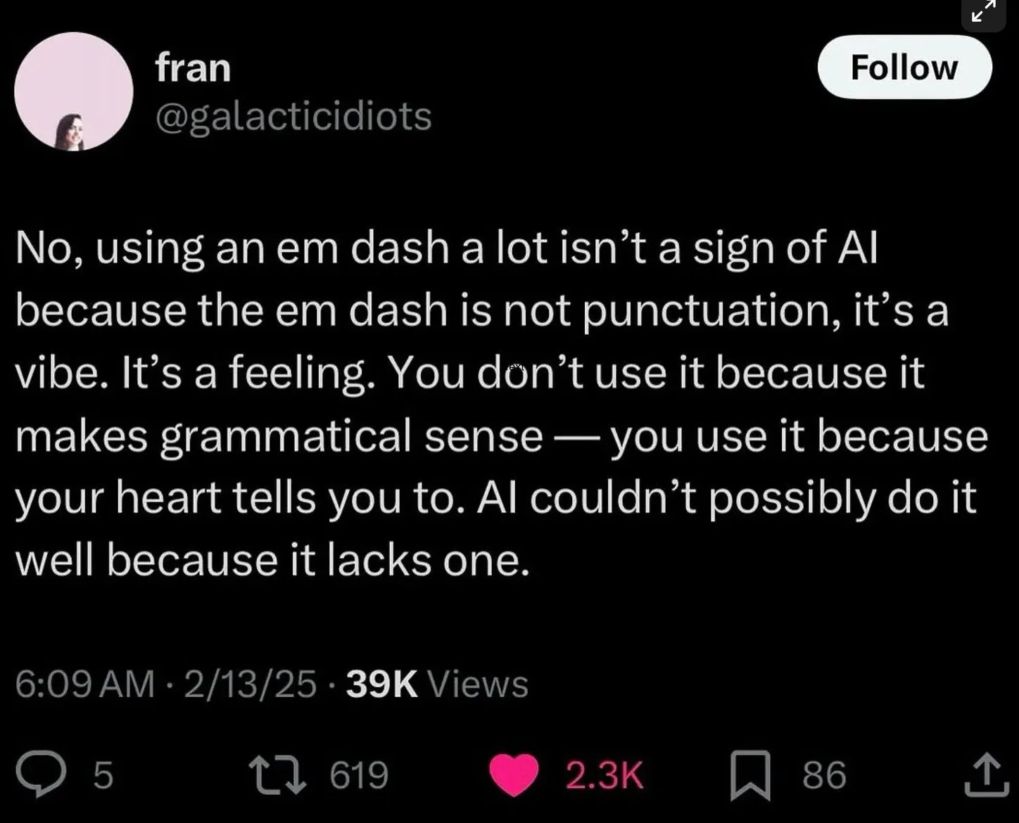 My favorite punctuation mark—meant to highlight important bits—has become the important bit itself. Let’s look at the AI issue.