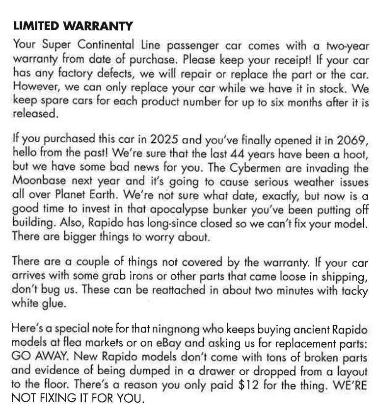 By far the overarching issue with this section is the company’s focus on the negative rather than the positive—the situations in which you can’t get your train fixed instead of what they can do for you. Even the bit about parts coming loose in shipping is strange. Why not help customers out by telling them the simple fix and apologizing because products shouldn’t fall apart in transit, should they? This situation seems like a good opportunity for a customer to call, make a connection, and perhaps order more parts.