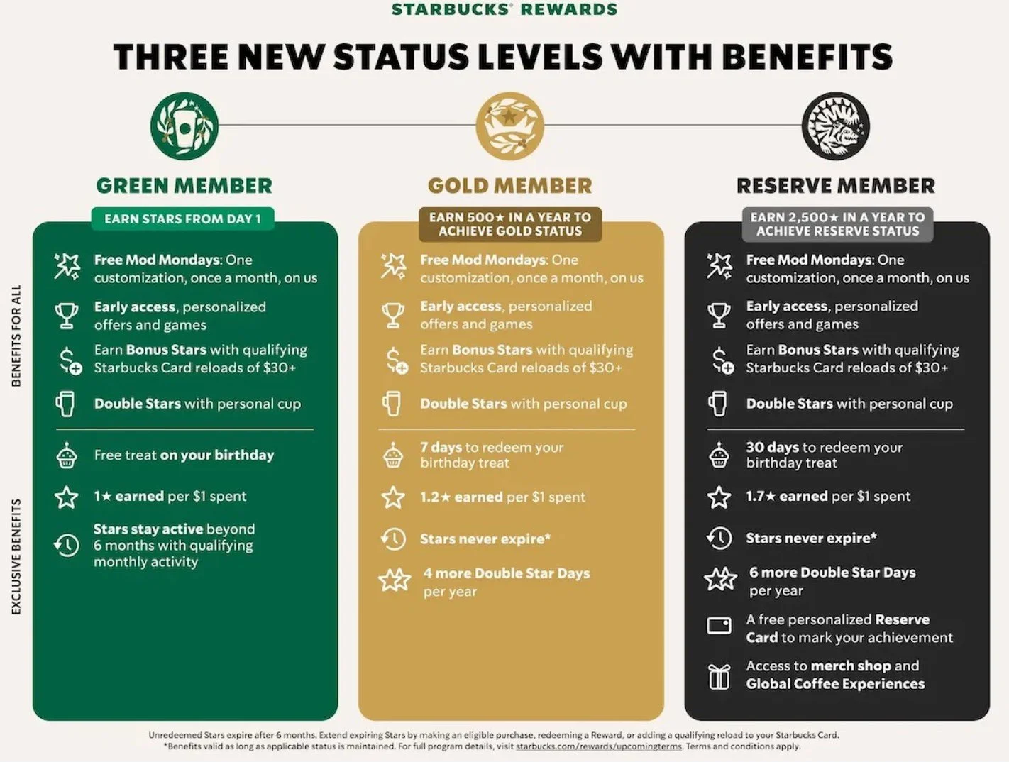 As always, customers earn “Stars” for buying stuff—more stars for more expensive stuff. But the company is moving away from everyone earns equally back to levels: Green and Gold, as in the past, and the new one, Reserve.