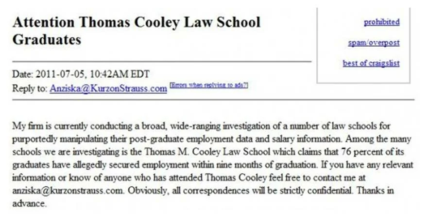 To defend its data, Cooley issued a report (download) claiming, "Study Shows Lawyers Have One of the Highest Employment Rates of All Professional Occupations." Cooley has also responded with a lawsuit of its own against the plaintiffs' attorneys claiming defamation because of ads such as this: