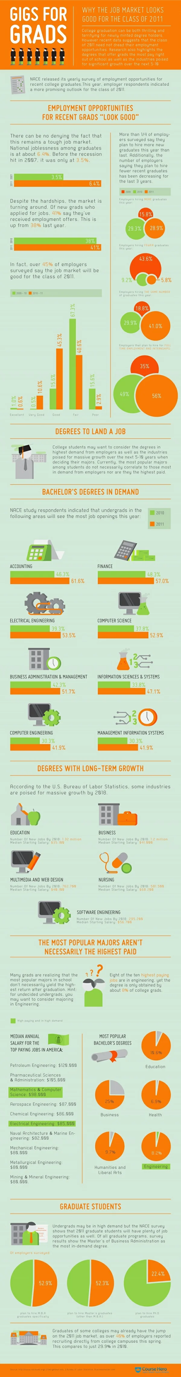Course Hero created this infographic to summarize recent research about college graduates' job prospects. You'll see quite a lot of good news according to the National Association for Colleges and Employers, including an average salary offer increase of 4.8% for 2011 grads. Also, the U.S. Bureau of Labor Statistics has identified several areas for large growth by 2018: education, business, multimedia and web design, nursing, and software engineering.