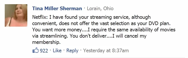 In response to Netflix's plan change announcement, more than 11,000 customers within two days have posted comments like this one, which received 922 "Likes."