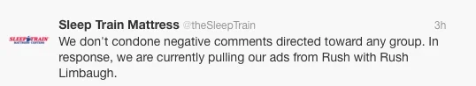 "Unfortunately, your public comments were not well received by our audience, and did not accurately portray either Rush Limbaugh's character or the intent of his remarks. Thus, we regret to inform you that Rush will be unable to endorse Sleep Train in the future.