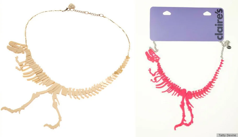 Tatty Devine's website shows several suspiciously close comparisons between its jewelry designs and those of Claire's, a 3000-store retailer of jewelry and accessories. Tatty Devine's jewelry is high-end; the "dinosaur" necklace shown on the left side is handmade from bones and costs £132, while Claire's version is rubber and costs £4.