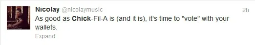 Although Chick-fil-A did find some support on Twitter and Facebook, many comments, such as this one, opposed the company's view:
