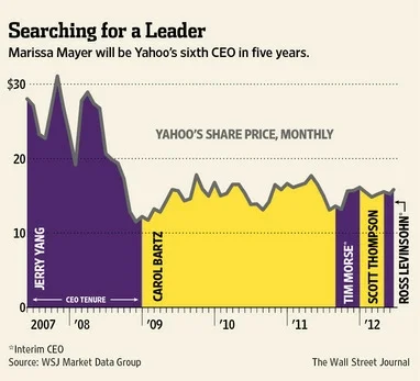 Let's hope this one sticks around. Marissa Mayer, former Google VP, will be Yahoo's sixth leader in just five years. Mayer follows Scott Thompson, fired for misleading academic information on his resume, and Carol-"I've-just-been-fired-over-the-phone"-Bartz (and two interim CEOs in between).