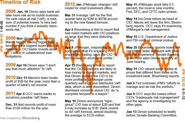 In advance of the testimony, BloombergBusinessWeek compiled this "Timeline of Risk," under the article title, "House of Dimon Marred by CEO Complacency Over Unit's Risk."