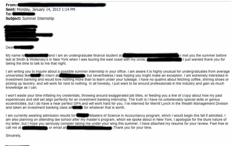 Calling your university "average," offering to "fetch coffee," and admitting to having no "special skills"- these are not compelling reasons to hire a job candidate. But the letter has been forwarded among colleages at financial firms, and the comments are positive. Some call it one of the best cover letters they have ever seen. Wow.