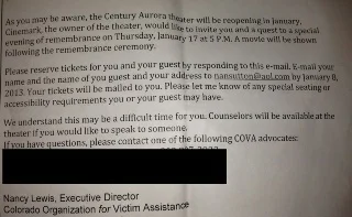 During the holiday we didn't think anyone or anything could make our grief worse but you, Cinemark, have managed to do just that by sending us an invitation two days after Christmas inviting us to attend the re-opening of your theater in Aurora where our loved ones were massacred.Thanks for making what is a very difficult holiday season that much more difficult. Timing is everything and yours is awful.