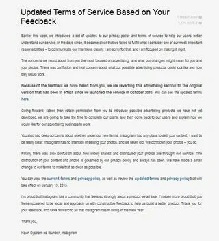 - What's your reaction to Instagram's first revision to its privacy policy?