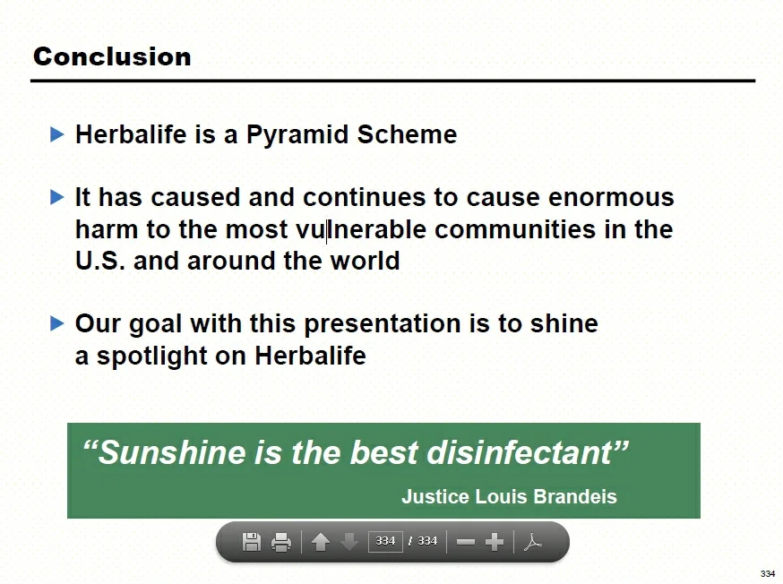 Bill Ackman, CEO of Pershing Square Capital Management, called the weight management and nutritional supplement company a "pyramid scheme." In a 334-slide presentation, Ackman explained why his hedge fund is shorting the stock, with a price of 0 and anticipation of the company's demise. Ackman said he felt so , "I don't want to make any money from this, 100% will go to the Pershing Square Foundation."