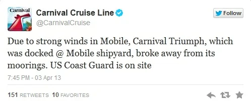 Although the crises are mounting for the cruise company, it's getting better at responding via social media. The company quickly tweeted about the situation and posted several updates throughout the day: