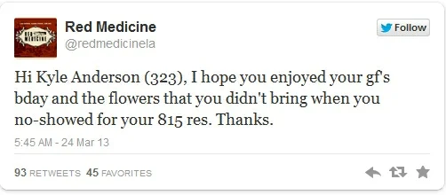 Noah Ellis of Beverly Hills restaurant Red Medicine did what most owners would like to do but wouldn't dare: called out no-shows on Twitter.