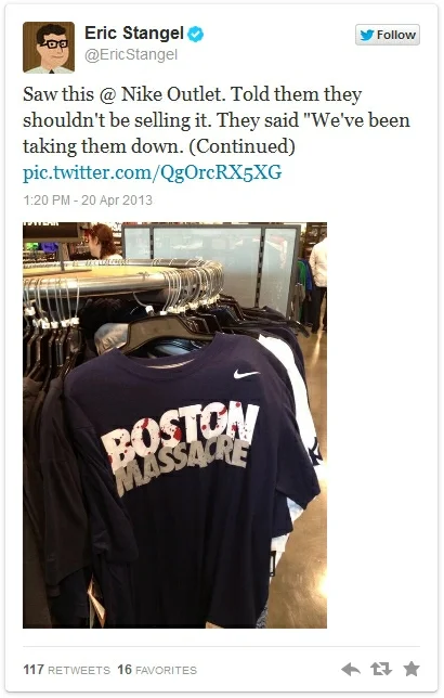 "The shirts being referenced are older baseball shirts that were predominantly being sold through our Factory Stores Outlets. In light of the tragedy in Boston we took immediate action last week to remove this product from distribution. We conducted this process as quickly as possible and are confident the product has been removed from distribution."