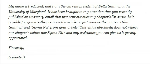Apparently, the last straw was an event with Sigma Nu fraternity, during which some sisters weren't at their best. Still, one wonders whether their behavior was so egregious as to deserve being threatened: "I will...assault you."