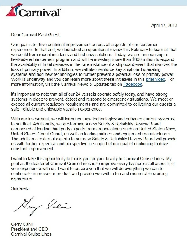 In a letter from CEO Gerry Cahill, Carnival tries to restore guests' confidence in the brand after several technical and other issues on ships during the past few months. In addition to this letter, Carnival has posted a video on YouTube and created a News and Updates page on Facebook.