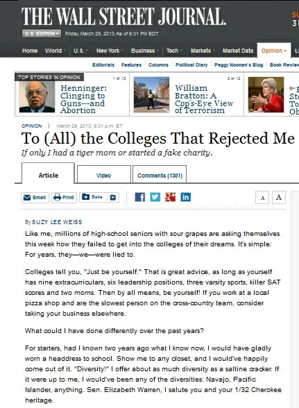Like many high school seniors, Suzy Lee Weiss is receiving her share of college rejection letters. Disappointed-and clearly more than a little peeved-Weiss published a letter in The Wall Street Journal, "To (All) the Colleges That Rejected Me."