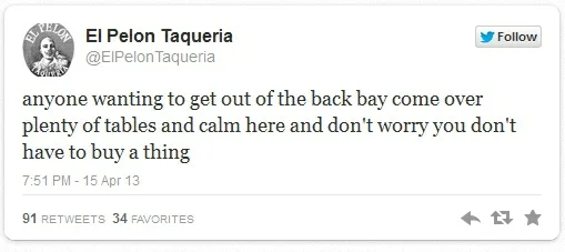 Where companies failed during Hurricane Sandy, at least one business got "goodwill" right during the Boston Marathon explosions. El Pelon Taqueria offered runners and others affected a place to relax, eat, and charge a phone-whether or not they can pay.