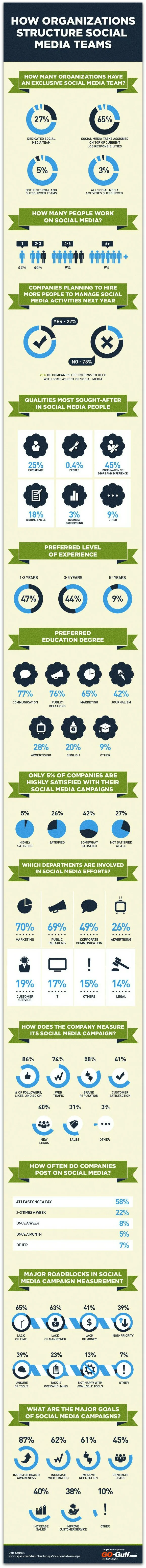 A Ragan/NASDAQ OMX Corporate Solutions survey of 2,714 communicators uncovered how organizations' social media teams are structured. This infographic, created by Go-Gulf.com, highlights a few interesting facts about those who completed the questionnaire: