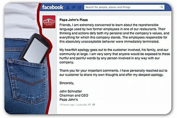 In addition, CEO John Schnatter posted this message on the company's Facebook page:
