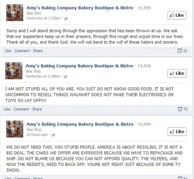 Amy's Baking Company is in the social media news again for angering customers. Back in August 2010, Amy responded to a negative Yelp review by calling the customer a "moron" and saying that "only tramps and losers want to sit outside in 110 temperatures" (although she used more capital letters and exclamation marks than I have).