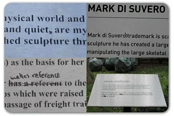 I want to meet this person: someone with a sharp grammatical mind and a sharp pen fixed errors at a sculpture park at the Pratt Institute in Brooklyn. As yet, no one has accepted responsibility, but I may have found my soul mate.