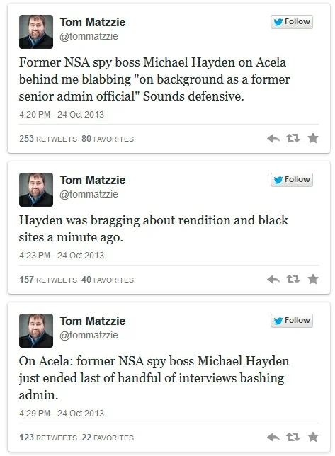 Spies: Don't talk on the phone while on a public train. A passenger on an Acela train near Philadelphia overheard former CIA and NSA director Michael Hayden criticizing the Obama Administration during an interview.