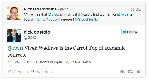 In response to the criticism, CEO Dick Costolo attacked Vivek Wadhwa, who was quoted in the NY Times article: