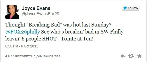 Not quite as tasteless as the CEO of AIG comparing its bonus controversy to lynchings, but a news anchor was criticized for comparing Philadelphia shootings to the TV series "Breaking Bad."