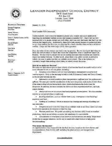 A school district in Leander, TX, took too long to announce a delayed opening because of icy weather, and people were upset. By the time parents heard that schools would open two hours late, many of them were already on dangerous roads. Some kids were on buses, one of which skidded off the road. Fortunately, no one was hurt.