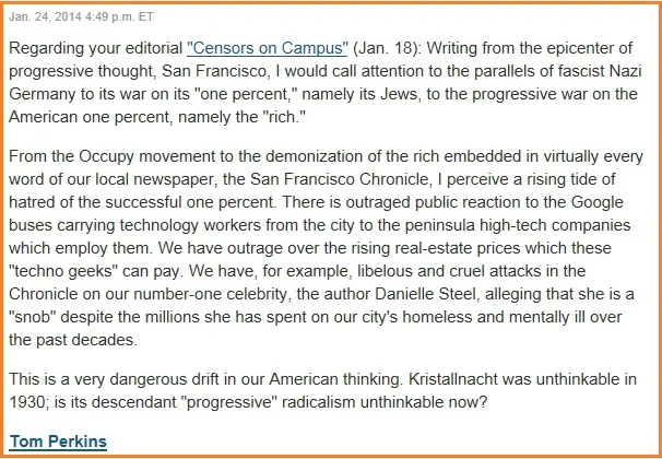 Tom Perkins, founder of investment firm Kleiner Perkins Caufield & Byers, has apologized for comparing the Occupy movement to Kristallnacht. In a letter titled "Progressive Kristallnacht Coming?" published in the Wall Street Journal, Perkins writes,