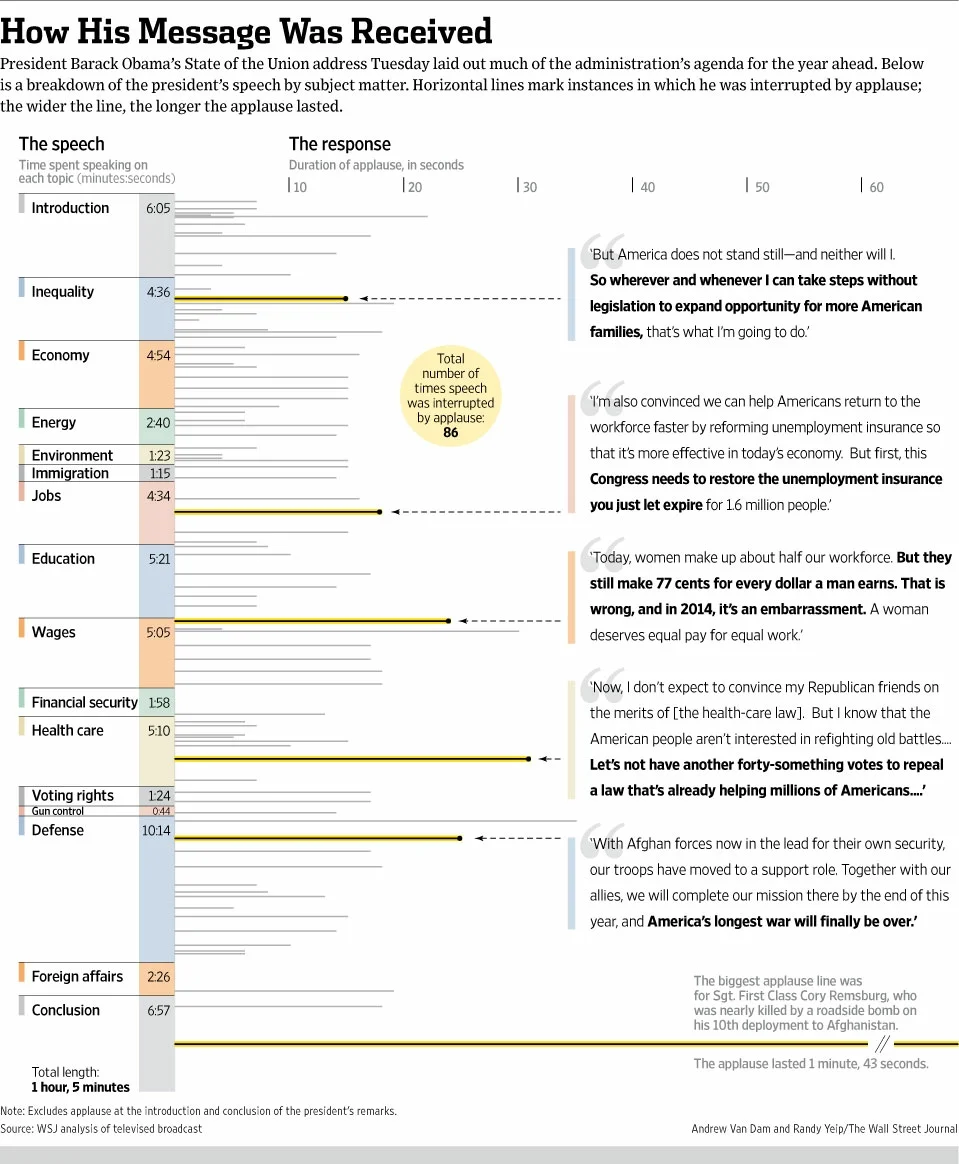 A Wall Street Journal graphic summarizes the 86 times the President's speech was interrupted by applause. The winning comments were about a military officer who almost lost his life in Afghanistan and about equal pay for women.