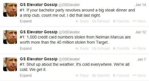 Here's the first parody Twitter feed turned into a book: @GSElevator, quips presumably heard on an elevator at Goldman Sachs.