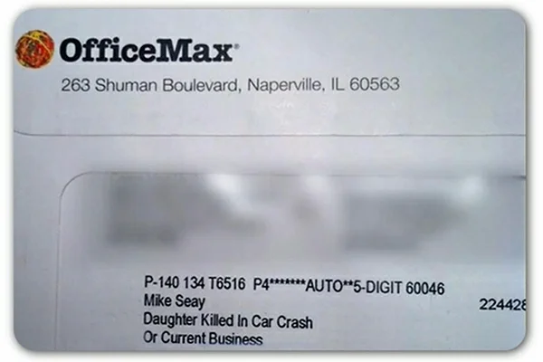 A promotional letter from OfficeMax identified a customer by name and a line under it: "Daughter Killed in a Car Crash." The Seays' daughter, 17 years old, was killed in a car accident last year, so the information is accurate, but you might imagine how upset the family was to read such an address.