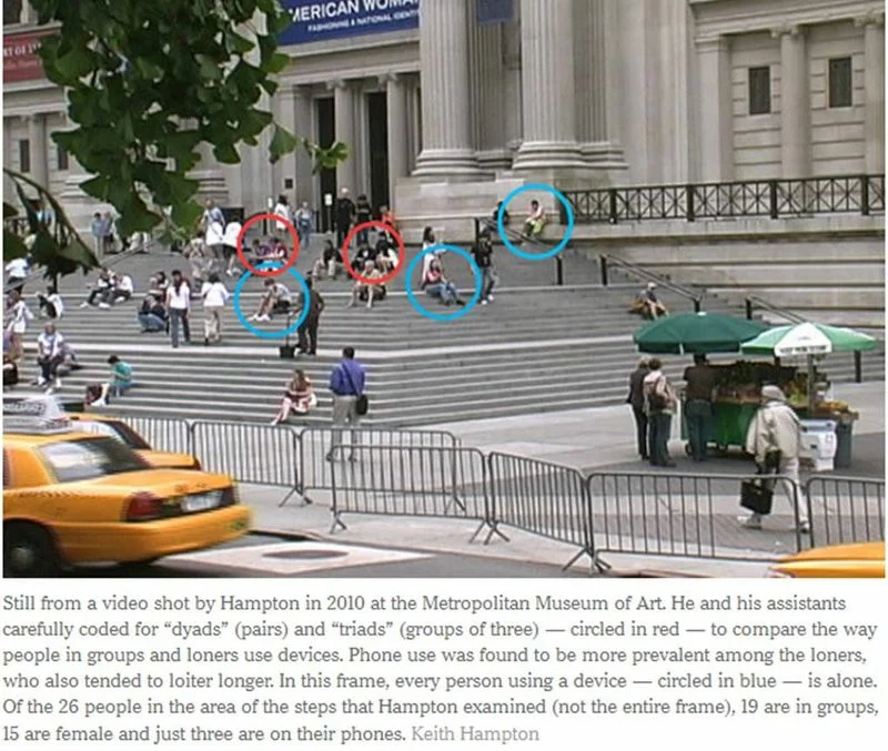 Between 2008 and 2010, a University of Pennsylvania research team continued this work by filming people outside the Metropolitan Museum of Art. They coded 38 hours of footage based on sex, group size, loitering behavior, and phone use. The team found only 3% of adults on cell phones. As lead researcher Keith Hampton says,