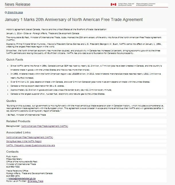 "The Government of Canada is retiring the traditional press release format in favour of a more digital-friendly product that makes the key messages of announcements clearer, quick facts more accessible and integrates more effectively with social media channels. . . . The old style release – which hasn't changed in over 50 years – disappeared on 31 December 2013. Gone with it are the dense blocks of text that make it hard to read, the use of long titles in headlines and leads and the use of complex jargon."