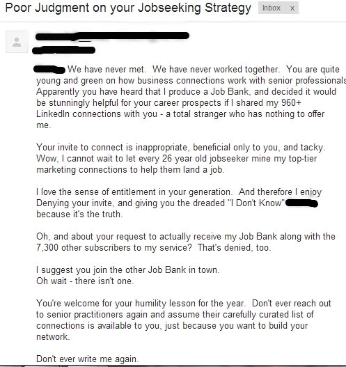 The winner of the IABC (International Association for Business Communication) "Communicator of the Year" award in 2013 may want to give back the prize. Kelly Blazek runs a Cleveland-based job bank and was tired of people such as this John Carroll University graduate asking for access to her connections (her Yahoo group). But Blazek's emails are too harsh.