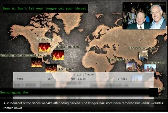In place of the company websites, hackers posted employees' names, email addresses, and social security numbers; however, officials say that no customer information was compromised. The hacking may be in response to Sands CEO Sheldon Adelson's support of Israel. One posted image shows Adelson pictured with Israel's Prime Minister Benjamin Netanyahu-and flames instead of hotel pictures around the world.