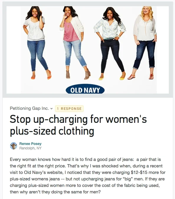 Although Old Navy didn't commit to changing its pricing, Posey posted a comment on Change.org calling the result a "success." At the same time, she acknowledged, "These are important first steps that will lead to the further changes we would like to see..." Following is the first paragraph, and the entire post is here.