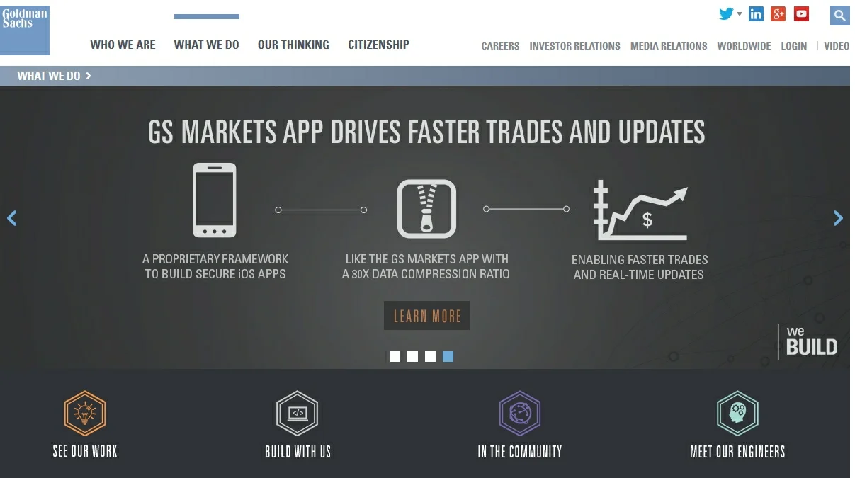 Goldman is using technology to create a hipper image. A new website shows the role of technology in the company, a Google Hangout connected computer scientists and Goldman recruiters, and short videos were created on these topics: