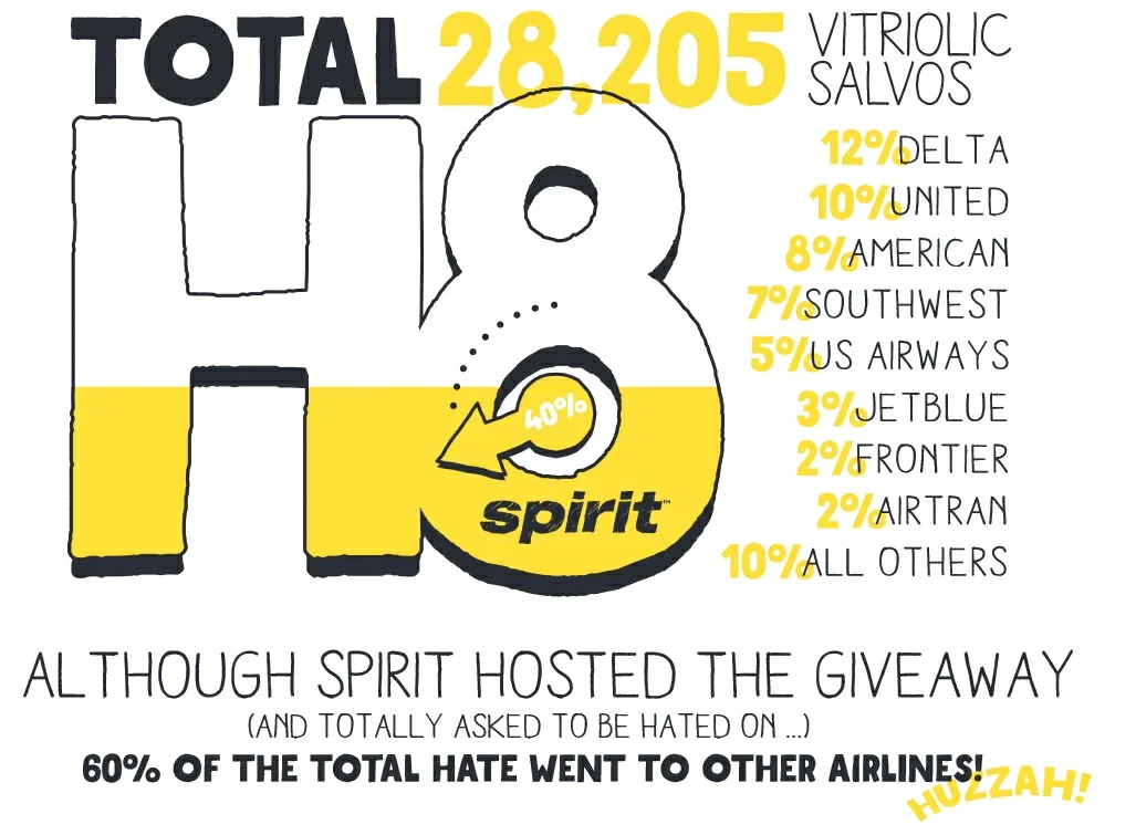Here's a new marketing strategy: Ask customers why they hate you and reward them for it. Spirit Airlines encouraged responses in exchange for 8,000 frequent flier miles: hate for eight, or H8. The company received more than 30,000 comments.