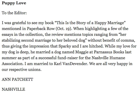 A New York Times book reviewer missed a comma, according to the book author, implying that she is married to her dog.