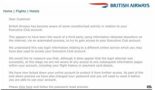 British Airways' Executive Club members complained of unknown hotel bookings and phone number changes, but the company said only a few frequent flier members were affected. Critics say that BA shouldn't ask users to click a link to change their password, which is confusing because this is a common phishing scheme. The company sent an email to Club members.