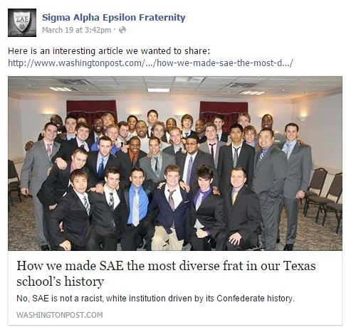 On its Facebook page, SAE posted a picture and link to a Washington Post article about a diverse chapter at Midwestern State University. The fraternity also gave a news conference about its diversity initiatives.