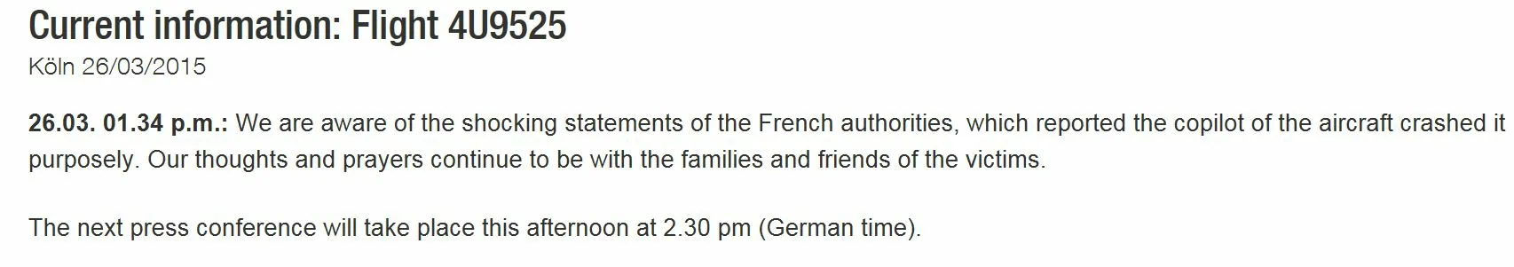 Updates on the Germanwings website have been steady since the crash was reported, with the most recent statement acknowledging reports of the colot's intention.