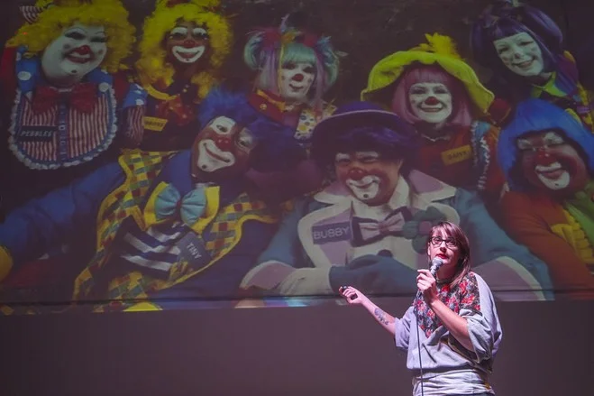 At Adobe, an employee is given a topic, such as whales, 30 seconds before she gets up to speak for nine minutes. While speaking, she and the audience see random photos, such as bare-chested men, which she tries to incorporate into the presentation.