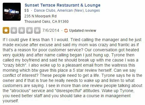 It's not the first time, and it won't be the last. The owner of LA restaurant Sunset Terrace Restaurant & Bar didn't like a review and told all of us about it.