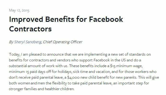 Facebook is taking a stand to increase wages. In a statement, COO Sheryl Sandberg described new standards for companies who want to do business with Facebook. The first paragraph is shown here: